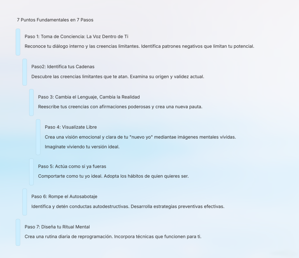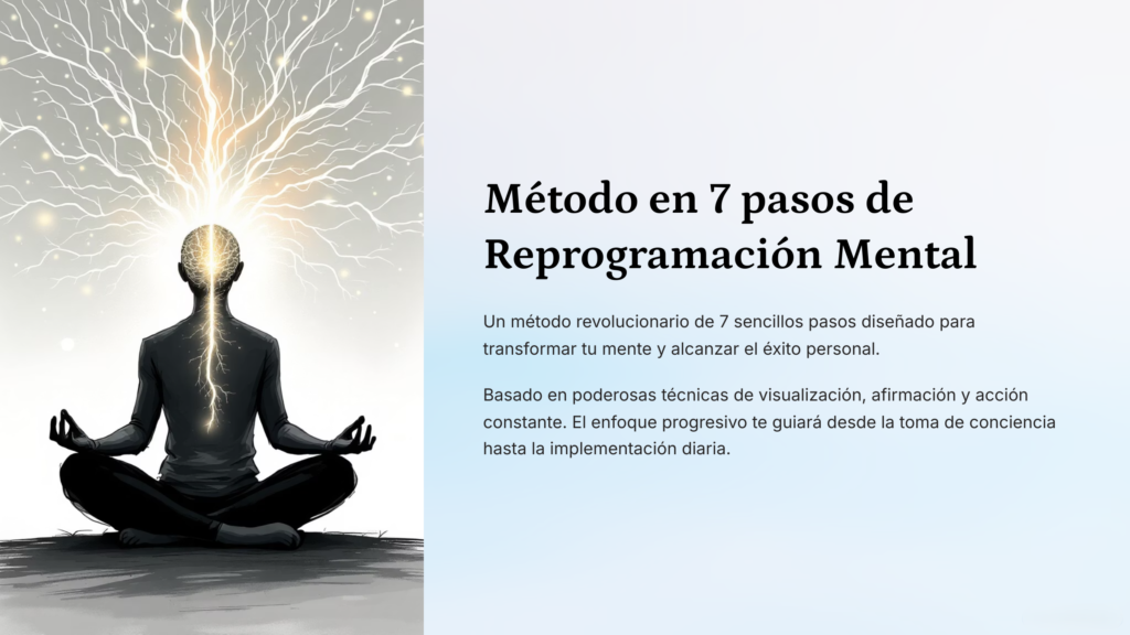 Con el «Metodo en 7 Pasos para Reprogramar tu Mente «, descubrirás cómo romper con creencias limitantes, activar tu verdadero potencial y empezar a crear la vida que realmente mereces.