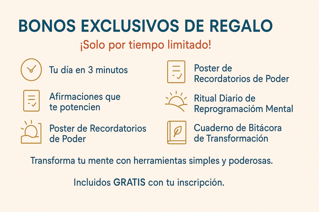 Todo con ejercicios simples de visualización, afirmación y acción diaria. No necesitas más tiempo. Solo decisión.